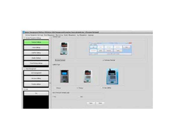 Dans cette partie du logiciel, l’administrateur peut définir les paramètres habituels de l’application de gestion de file d’attente, comme : la configuration du ticket de file d’attente émis par le distributeur, le réglage du port de communication, l’affichage à led, les appels téléphoniques, les différents types de services, la quantité de compteurs et maintenance de la base de données, les langues…